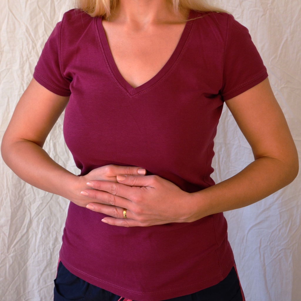 Setze oder stelle dich bequem hin, Konzentriere dich auf deine Bauchregion und achte auf das stetige Heben und Senken deiner Bauchdecke. Leg eine Hand zwischen Bauchnabel und Brustbein und atme bewusst ein – spüre wie der Sauerstoff durch deinen Körper fließt – und langsam und kontrolliert wieder aus. Mindestens zwei bis drei Minute sollte diese Übung durchgeführt werden.