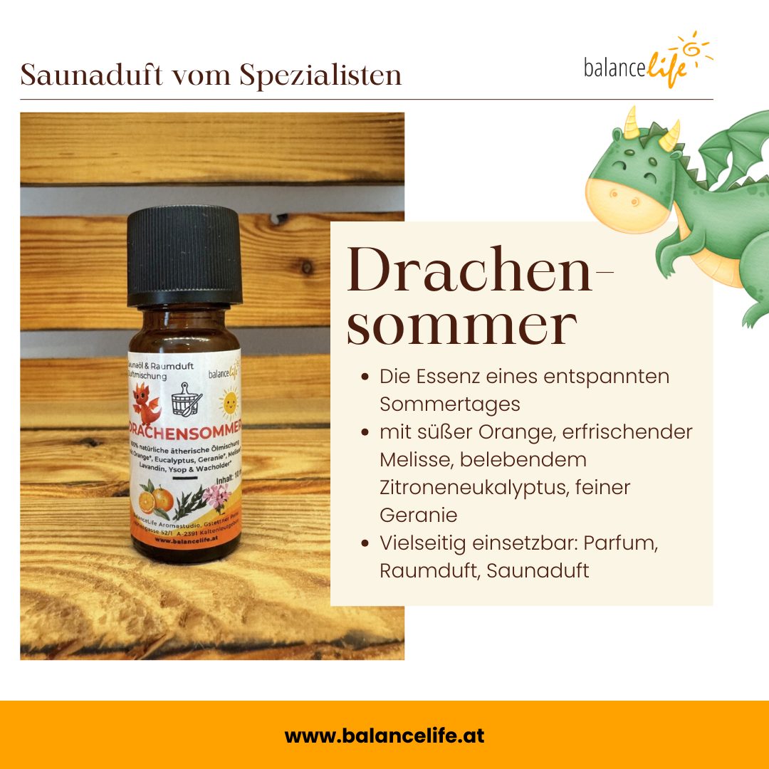 Unsere exklusive Aromamischung Drachensommer für Sauna oder Diffuser bringt Leichtigkeit und Frische in den Alltag deiner Mama.