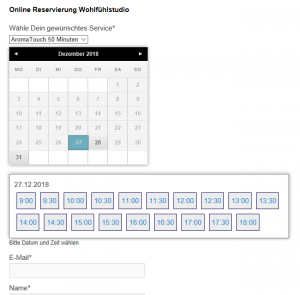 Einfach auf der Seite das gewünschte Service (AromaTouch = Aroma-Massage) auswählen, dann das gewünschte Datum und die gewünschte Zeit wählen und alle persönlichen Daten eingeben. Nach Bestätigung des Formulars bekommst Du per Mail eine kurze Bestätigung Deiner Reservierungsanfrage und dann auch noch eine Bestätigung von mir. Ich muss die Reservierung noch zusätzlich bestätigen. Bei Fragen stehe ich gerne zur Verfügung und hoffe das Service gefällt Dir.