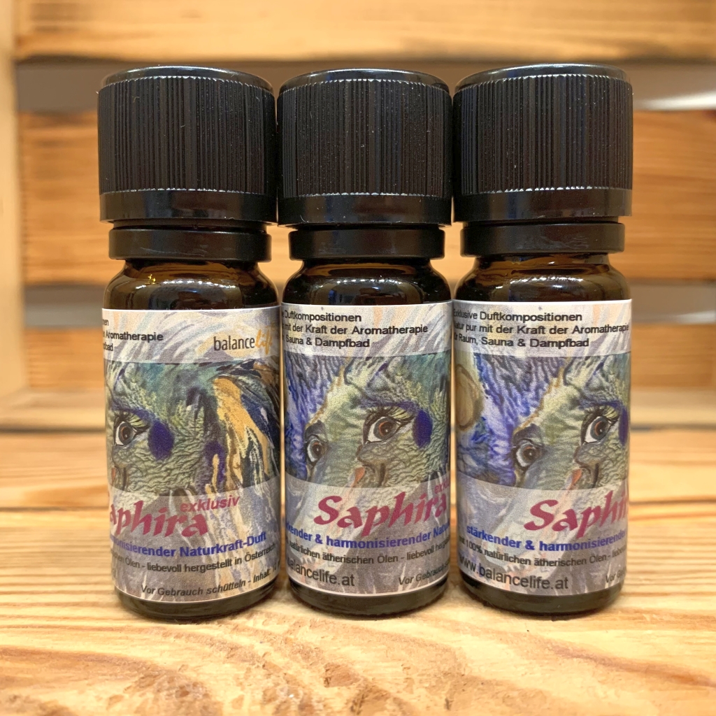 Ich wünsche euch viel Freude mit dieser besonderen Duftkomposition. Sie empfiehlt sich als Parfum für besondere Anlässe, als Raumduft (Diffuser, Duftstein, Duftherz…) aber auch als außergewöhnlicher Saunaduft. Vielleicht kannst Du dann auch Saphira spüren oder sehen….