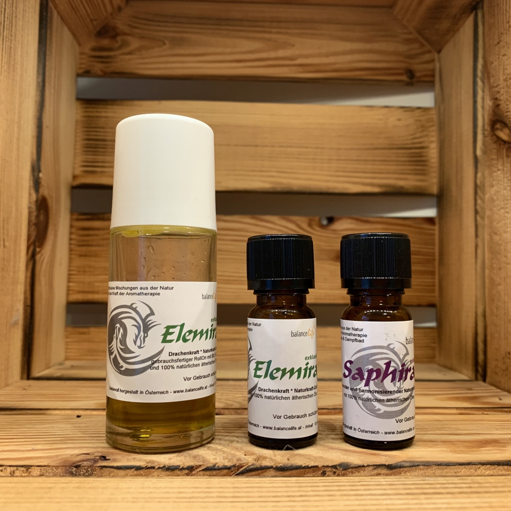 Die neueste exklusive Ölmischung vom Aroma-Spezialisten ist besonders kraftvoll und enthält unter Anderem Jasmin, Fenchel, Majoran und Lavendel. Die Aromamischung schenkt positive Energie und gibt Kraft in vielen schwierigen Situationen wie zum Beispiel bei Regelbeschwerden. Elemira gehört zur BalanceLife Drachenkraft Serie – besondere Mischungen für besondere Situationen.
