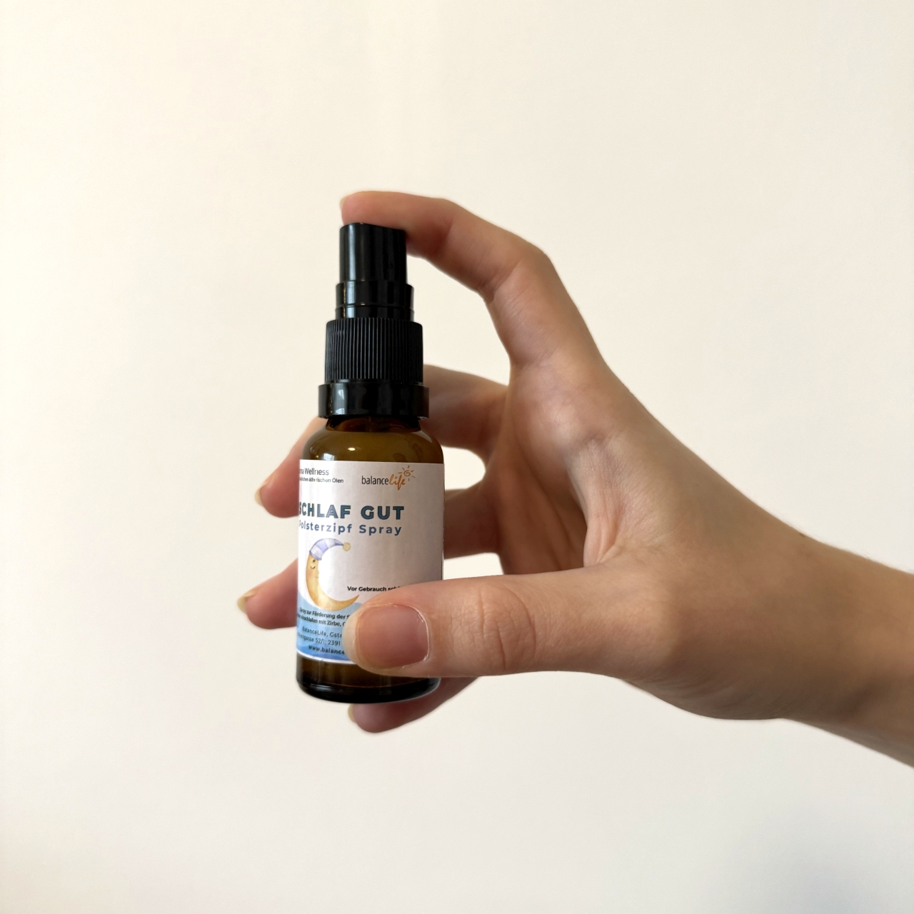 - Sprühe 2–3 Sprühstöße direkt auf dein Kopfkissen oder in die Luft.