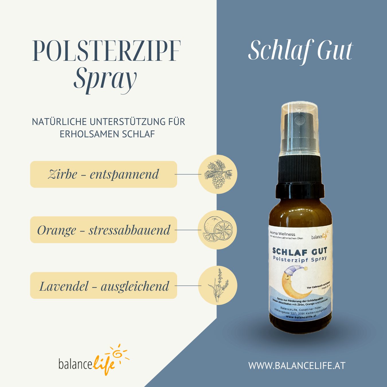 Erlebe die Magie eines erholsamen Schlafes mit dem Polsterzipf Spray „Schlaf Gut“.