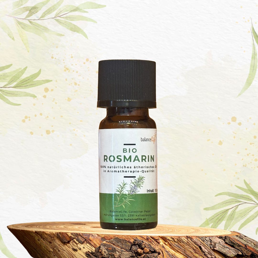 Rosmarin wirkt kreislaufanregend, durchblutungsfördernd, stärkt das Verdauungssystem, lindert Kopfschmerzen, hilfreich bei Gelenksproblemen, unterstützt in Erkältungszeiten, festigt das Gewebe, Hauttonikum, zellerneuernd, in der Haarpflege bei Schuppen und Haarausfall, wirkt bei mentaler Erschöpfung, regt die Gehirntätigkeit an, macht wach, konzentrationsfördernd, allgemein stärkend.